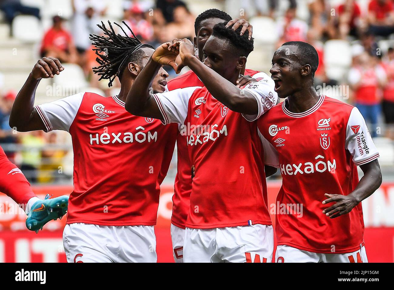 Folarin Balogun Aus Reims Feiert Sein Tor Mit Seinen Teamkollegen Wahrend Des Fussballspiels Der Franzosischen Ligue 1 Zwischen Stade De Reims Und Clermont Foot 63 Am 14 August 2022 Im Auguste Delaune Stadion